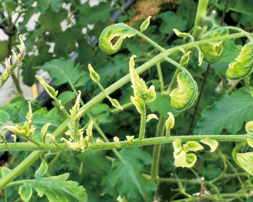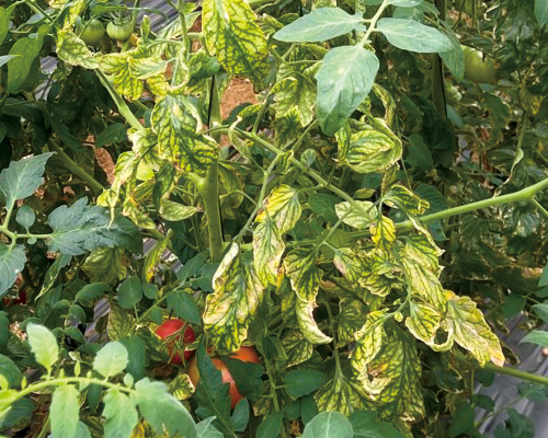 토마토를 재배하고 있는 농가입니다. 토마토 어린잎이 쪼그라들고 노랗게 변하거나 아래쪽 잎부터 노랗게 얼룩덜룩해지고 생육이 좋지 않아요. 원인이 뭘까요?