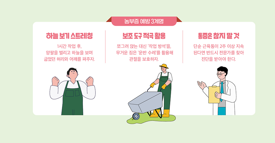 농작업 후에는 따뜻한 찜질이나 가벼운 스트레칭을 통해 근육을 풀어주면 통증 예방에 효과적이다.