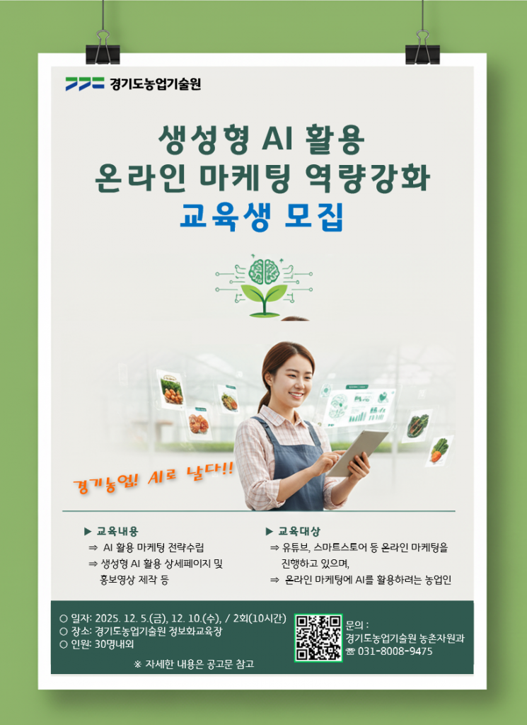 경기도농업기술원에서는 생성형 AI를 활용하여 온라인 마케팅을 확대하고, 소비자↔농업인 직거래 활성화 및 농가소득 증진을 위한 「2025년 농업인 스마트경영 정보화 역량강화 교육」을 아래와 같이 운영합니다.
